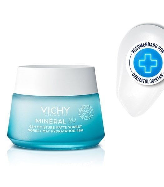 Gel hidratante facial. Vichy Minéral 89 Sorbet Mat Hydratation 48h garante uma sensação única de frescor e bem-estar.